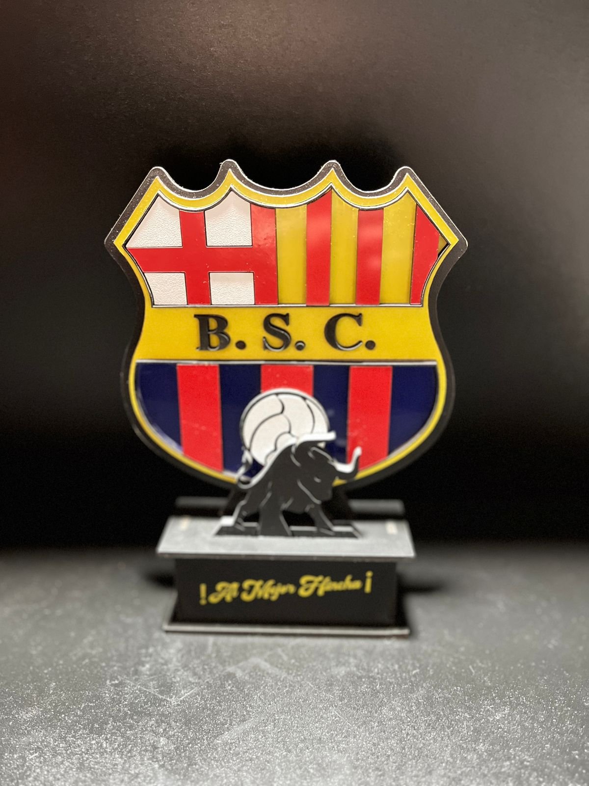 CARACTERISTICAS Detalle: Reconocimiento ideal para el mejor hincha barcelonista, Vinil adhesivo y diseño en capas MDF Material: AcrÃlico, vinil, adhesivo y MDF  con base MDF ALTO: 19 cm ANCHO: 15 cm