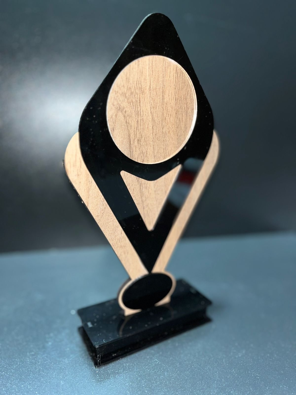 CARACTERISTICAS Detalle: Reconocimiento personalizable ideal para eventos deportivos, sociales y culturales Material: AcrÃlico negro y MDF Â texturizado con base MDF ALTO: 21 cm ANCHO: 13 cm