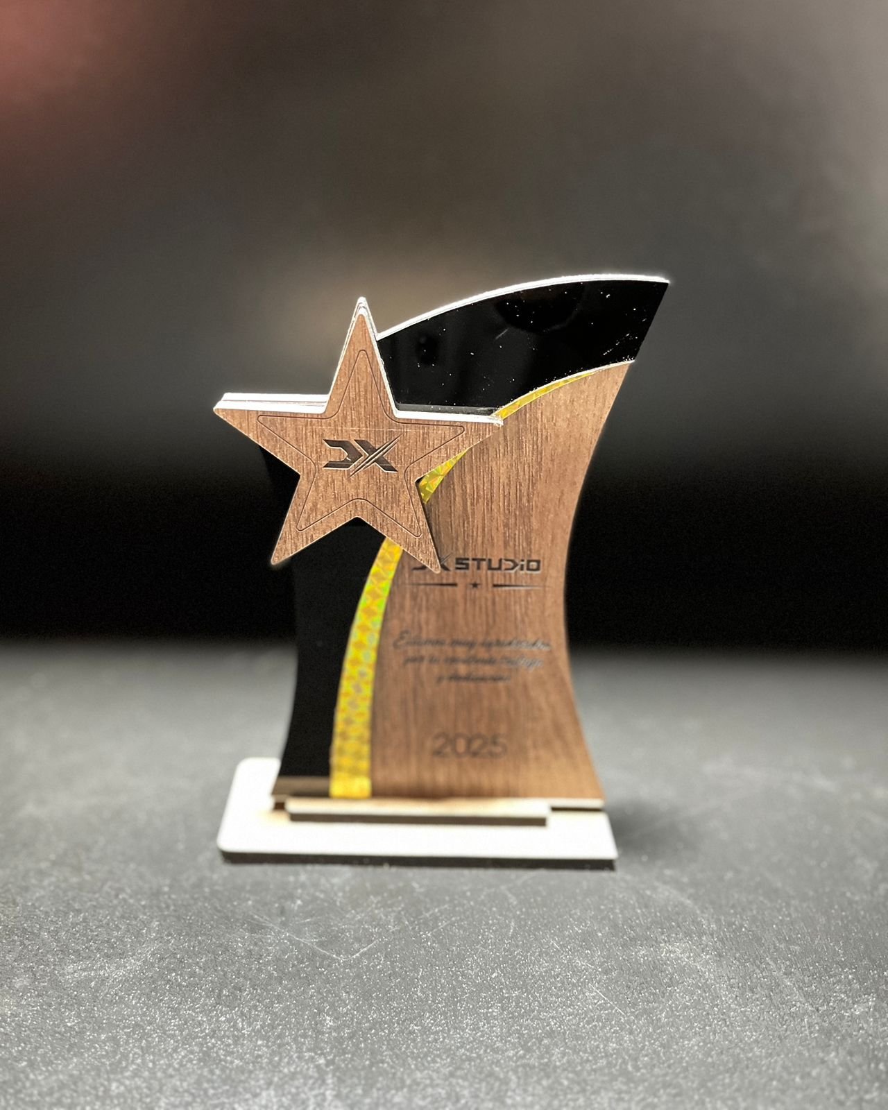 CARACTERISTICAS Detalle: Reconocimiento ideal para eventos sociales, culturales y deportivos. Material: Acrílico negro y MDF  texturizado con base MDF ALTO: 21 cm ANCHO: 13 cm