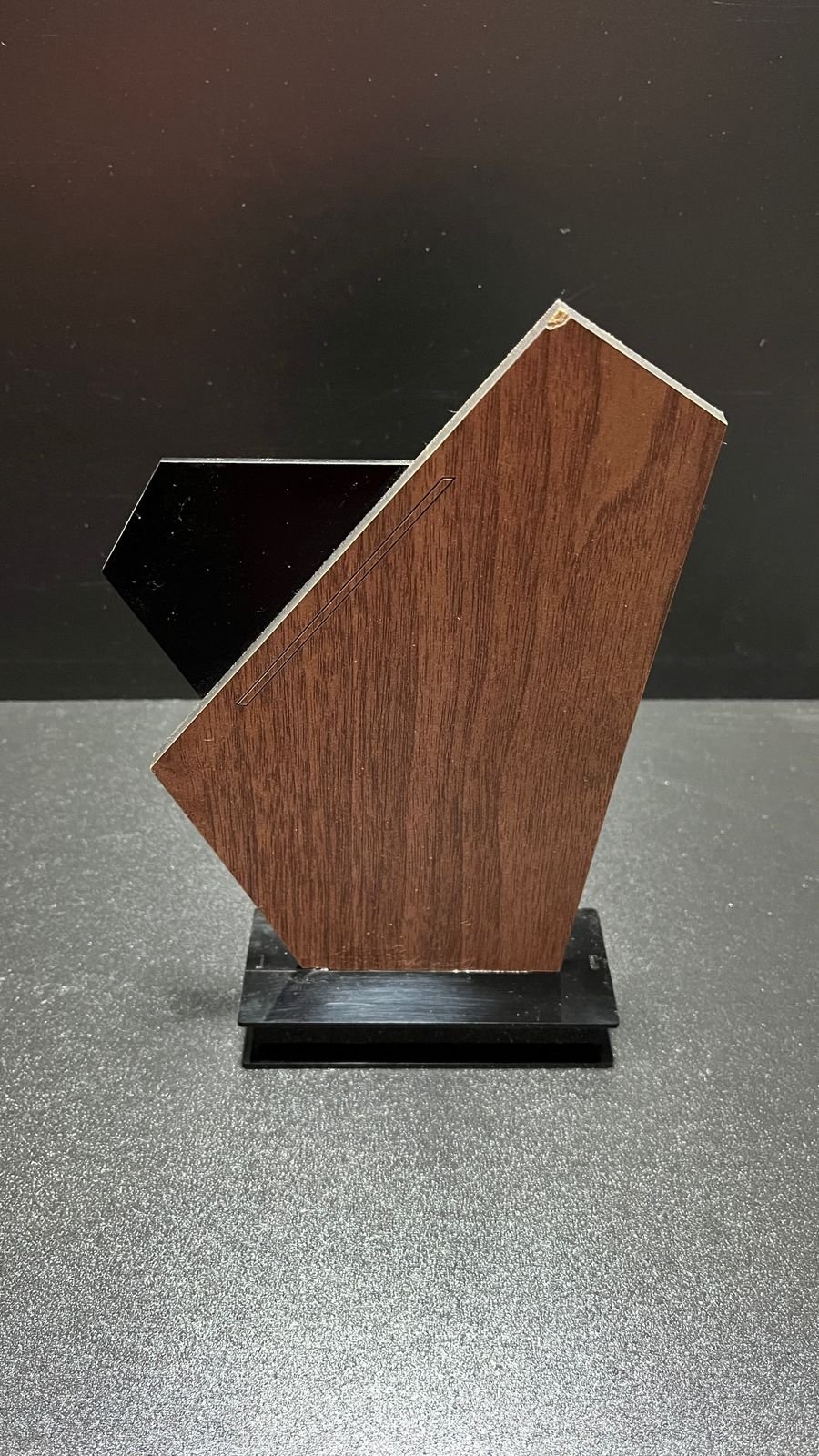 CARACTERISTICAS Detalle: Reconocimiento ideal para galas y textos cortos Material: AcrÃlico negro y MDF Â texturizado con base MDF ALTO: 20 cm ANCHO: 12 cm